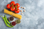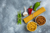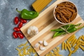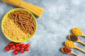 Dwa rodzaje surowego makaronu na zielonym talerzu z surowych gniazd makaronowych. Wysokiej jakości zdjęcie