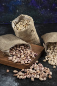 Worek z ekologicznej surowej fasoli umieszczony na powierzchni marmuru. Wysokiej jakości zdjęcie