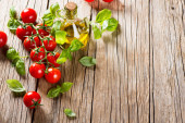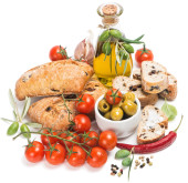 świeży chleb z oliwki, pomidory, przyprawy i oliwa z oliwek na ol