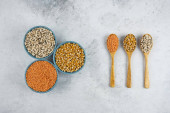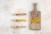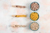 Widok z góry Fasola, makaron i ciecierzyca w misach na białym tle. Wysokiej jakości zdjęcie