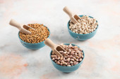 Zdjęcie "Widok z góry Fasola, makaron i ciecierzyca w misach na białym tle. Wysokiej jakości zdjęcie" może być wykorzystywane do celów osobistych i komercyjnych zgodnie z warunkami zakupionej licencji Royalty-free. Obraz jest dostępny do pobrania w jakości wysokiej rozdzielczości do 5760x3840.
