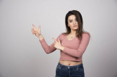 Młoda kobieta stojąca i pozująca na szarej ścianie. Wysokiej jakości zdjęcie