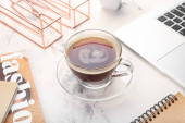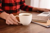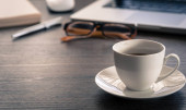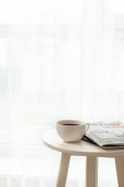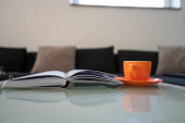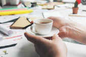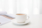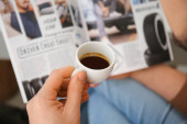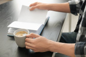 Człowiek z filiżanką kawy czytanie magazynu w biurze