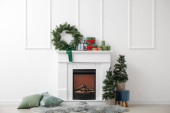 Wnętrze salonu urządzone na Boże Narodzenie z kominkiem
