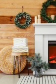 Wnętrze salonu urządzone na Boże Narodzenie z kominkiem