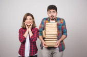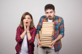 Zdjęcie młodej pary siedzącej na podłodze z książkami. Wysokiej jakości zdjęcie