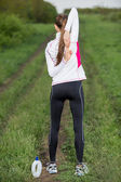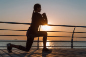 Fitness model sportowy w odzieży sportowej mody ze wschodem słońca niebo