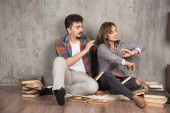 Zdjęcie młodej uśmiechniętej pary siedzącej na podłodze z książkami. Wysokiej jakości zdjęcie