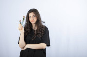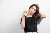 Śpiąca kobieta niosąca zegar na białym tle. Wysokiej jakości zdjęcie