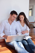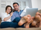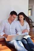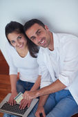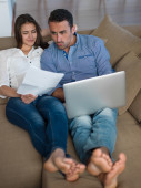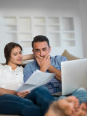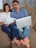 spokojny młoda para pracy na komputerze przenośnym w domu