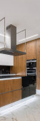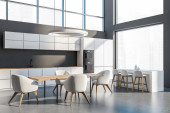 Zdjęcie "Pionowa panorama stylowej kuchni z białymi meblami, granitowymi płytkami podłogowymi i małym drewnianym stolikiem dla dwojga pod nowoczesnymi lampami wiszącymi" może być wykorzystywane do celów osobistych i komercyjnych zgodnie z warunkami zakupionej licencji Royalty-free. Obraz jest dostępny do pobrania w jakości wysokiej rozdzielczości do 5760x3840.