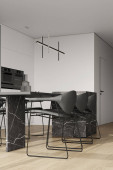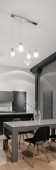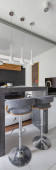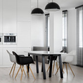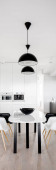 Pionowa panorama stylowej kuchni z białymi meblami, granitowymi płytkami podłogowymi i małym drewnianym stolikiem dla dwojga pod nowoczesnymi lampami wiszącymi