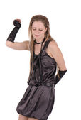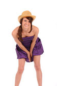Witamy gest ładna dziewczyna w fioletowy strój na białym tle