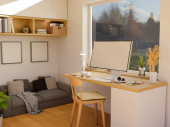 Część pokoju z biurkiem przy ścianie, krzesłem, dwie poduszki przy oknie i inne rzeczy