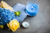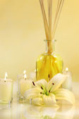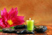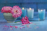 różowy Chryzantemowe kwiecie w misce wody z świece