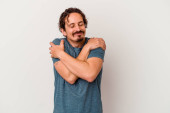 młody biały mężczyzna odizolowany na białym tle rozciągające ramiona, spokojna pozycja.