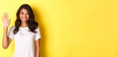 Zdjęcie "Portret usatysfakcjonowanej studentki amerykańsko-afrykańskiej, uśmiechniętej zadowolonej i okazującej dobry znak, jak coś dobrego, stojącej na żółtym tle" może być wykorzystywane do celów osobistych i komercyjnych zgodnie z warunkami zakupionej licencji Royalty-free. Obraz jest dostępny do pobrania w jakości wysokiej rozdzielczości do 5760x3840.