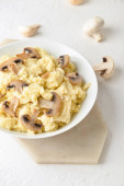 Miska ze smacznymi tłuczonymi ziemniakami i grzybami na białym tle