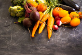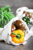 świeże warzywa organiczne w papierowej torbie na betonowym tle