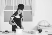 szczęśliwy dzieciak dziewczyna w gotowanie kapelusz i fartuch w kuchni, pieczenie