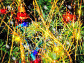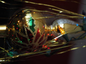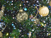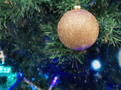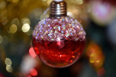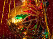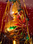 Kryształowa kula przed rozmytymi lampkami świątecznymi z opadami śniegu