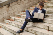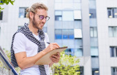 Zdjęcie "Młody przystojny mężczyzna pracujący na laptopie w plenerze IT w nowoczesnym parku, siedzący w pracy zdalnej, w stylu letnim, swobodny uśmiech. Miejski styl życia." może być wykorzystywane do celów osobistych i komercyjnych zgodnie z warunkami zakupionej licencji Royalty-free. Obraz jest dostępny do pobrania w jakości wysokiej rozdzielczości do 5760x3840.