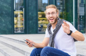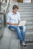 Przystojny hipster nosi okulary i czyta dokumenty, robi szkice, szkice, myśli o problemie, pracując zdalnie z laptopem, siedząc na zewnątrz. Młody mężczyzna biznesmen na odległość.