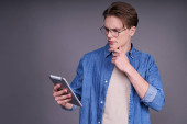 Zdjęcie "Przystojny hipster nosi okulary i czyta dokumenty, robi szkice, szkice, myśli o problemie, pracując zdalnie z laptopem, siedząc na zewnątrz. Młody mężczyzna biznesmen na odległość." może być wykorzystywane do celów osobistych i komercyjnych zgodnie z warunkami zakupionej licencji Royalty-free. Obraz jest dostępny do pobrania w jakości wysokiej rozdzielczości do 5760x3840.