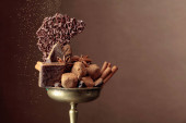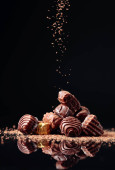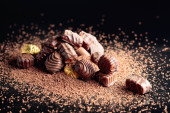 Czekoladowe cukierki na czarnym tle posypane czekoladowymi chipsami. Przestrzeń kopiowania.