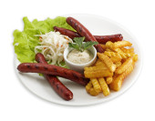 kiełbaski bawarskie z keczupem na białym tle na białym tle