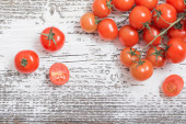 Świeże dojrzałe, żółte pomidory na białym drewnianym stole, płaskie układanki. Miejsce na tekst