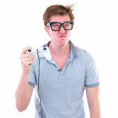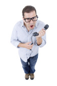 śmieszne frajerem młody mężczyzna krzyczy na telefon