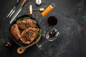 Zdjęcie "Pieczona pierś z kaczki podawana z sosem i świeżymi ziołami. Czarne tło. widok z góry" może być wykorzystywane do celów osobistych i komercyjnych zgodnie z warunkami zakupionej licencji Royalty-free. Obraz jest dostępny do pobrania w jakości wysokiej rozdzielczości do 5760x3840.
