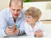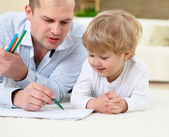 mały chłopiec i jego ojciec gra razem w domu na podłodze