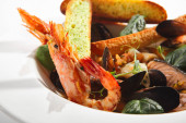 Owoce morza z sosem pomidorowym na białym talerzu restauracji. Krewetki owoce morza i gulasz pomidorowy ozdobione smażonym chlebem. Izolacja na białym tle