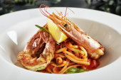 Zdjęcie "Owoce morza z sosem pomidorowym na białym talerzu restauracji. Krewetki owoce morza i gulasz pomidorowy ozdobione smażonym chlebem. Izolacja na białym tle" może być wykorzystywane do celów osobistych i komercyjnych zgodnie z warunkami zakupionej licencji Royalty-free. Obraz jest dostępny do pobrania w jakości wysokiej rozdzielczości do 5760x3840.