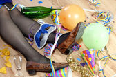 Sztandar młodej kobiety z czerwoną pocieraną szminką i czapką, śpiącej przy stole w brudnym pokoju po przyjęciu urodzinowym, zmęczonej kobiety po imprezie w domu
