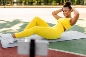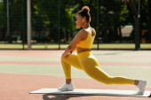 Sportowy czarny kobieta w żółty odzież sportowa kłamie i pozowanie