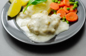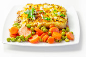 Przetarte kawałki wędzonego plamiaka i mintaja w kremowym sosie serowym siedziały pod zacierem maślanym podawanym z warzywami, klasyczny angielski posiłek