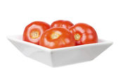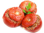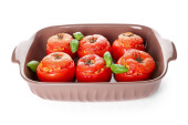 Naczynie do pieczenia z smacznymi pomidorami nadziewane na białym tle