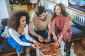 Grupa szczęśliwych przyjaciół o imprezę w domu, jedzenie pizzy i zabawy.
