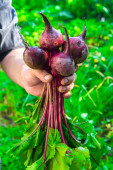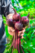 buraki w ręce kobiety w ogrodzie. Kontekst żywności