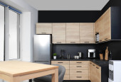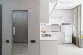 Panorama małej kuchni z białymi szafkami, drewnianą ścianą i stołem pod lampą dekoracyjną obok korytarza z niebieską ścianą i głównymi drzwiami wejściowymi