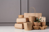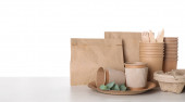 Jednorazowe produkty ekologiczne na białym drewnianym stole