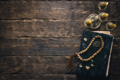 Biblia na drewnianym stole. Pochodzenie chrześcijańskie. Koncepcja wiary, nadziei i miłości.