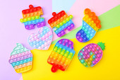 Kolorowe Push Pop It Bubble zmysłowe Fidget Zabawki o różnych kształtach na różowym tle, widok z góry