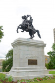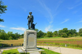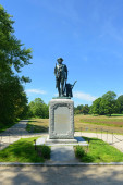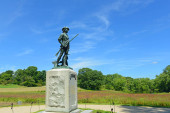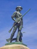 Minute Man Statua na North Bridge w Minute Man National Historic Park w historycznym centrum miasta Concord, Massachusetts MA, USA.