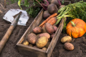 Zdjęcie "Zbiory różnych świeżych warzyw organicznych na glebie w ogrodzie z bliska. Świeżo zebrana marchewka, burak, dynia, cukinia, ziemniak, pomidor, pieprz i ogórek" może być wykorzystywane do celów osobistych i komercyjnych zgodnie z warunkami zakupionej licencji Royalty-free. Obraz jest dostępny do pobrania w jakości wysokiej rozdzielczości do 5760x3840.