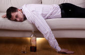 uomo d'affari ubriaco sprecato e la bottiglia di whisky nell'alcolismo