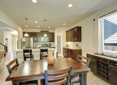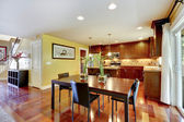 Pokój ciemny brązowy kuchnia z jadalnią